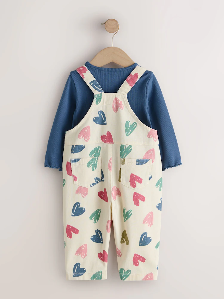 Ecru Heart Print Dungarees and T-Shirt Set