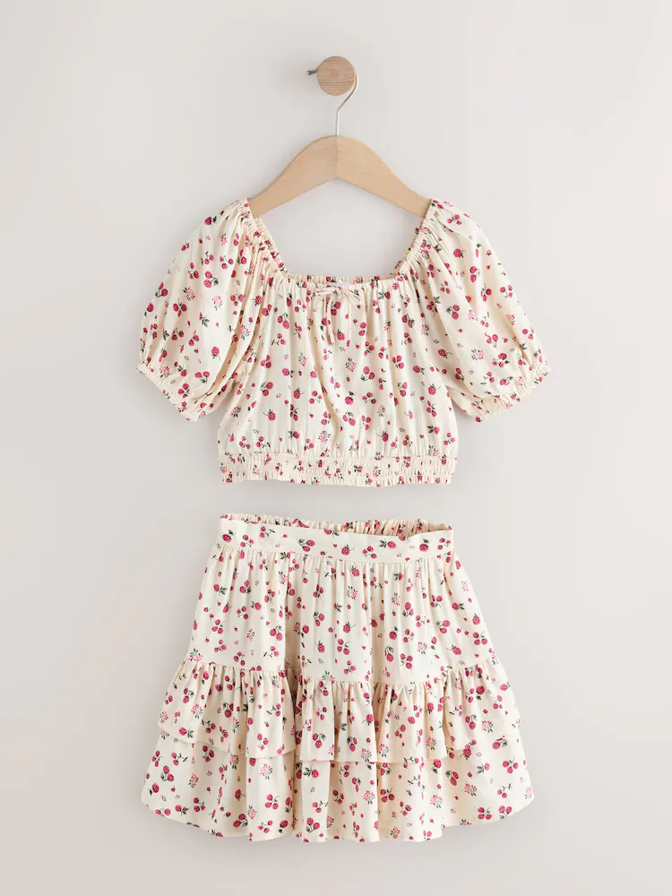 Ecru Strawberry Puff Sleeve Blouse and Skirt Set