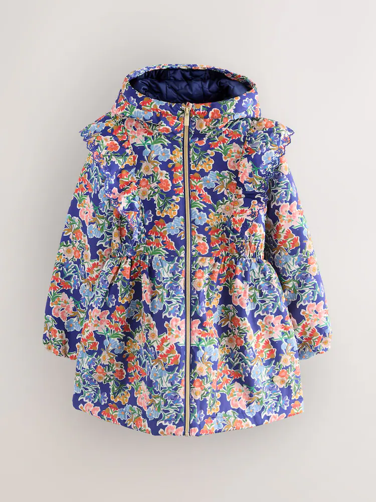 Keep her dry and stylish with the Laura Ashley Meadow Floral Frill Coat. This charming, showerproof coat features a playful all-over meadow floral print and a classic navy lining. Broderie frills on the shoulders, a zip fastening, and a cosy hood add delightful details. The elasticated waist creates a comfortable fit, while the longline silhouette provides extra coverage.