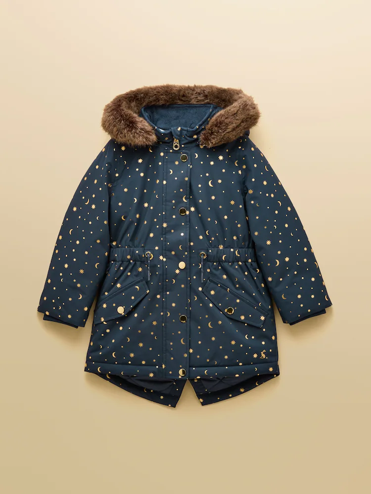 The Alix will be a functional and stylish addition to your little girls' wardrobe. Made for everyday wear, (the walk to school, trips to the park and winter days out), this piece will be something you'll reach for always. It's completely waterproof and is crafted to a classic parka style that includes a printed exterior, a fleece lined hood with removable fur trim, fleece lined pockets and has a warming quilted lining. The pockets are great for storing treasure and it's fastened with ease to finish.