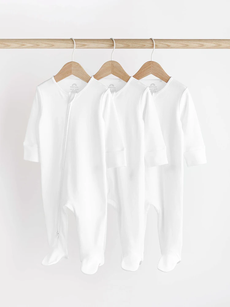 White Essential Zipped 100% Cotton Baby Sleepsuits 3 Pack